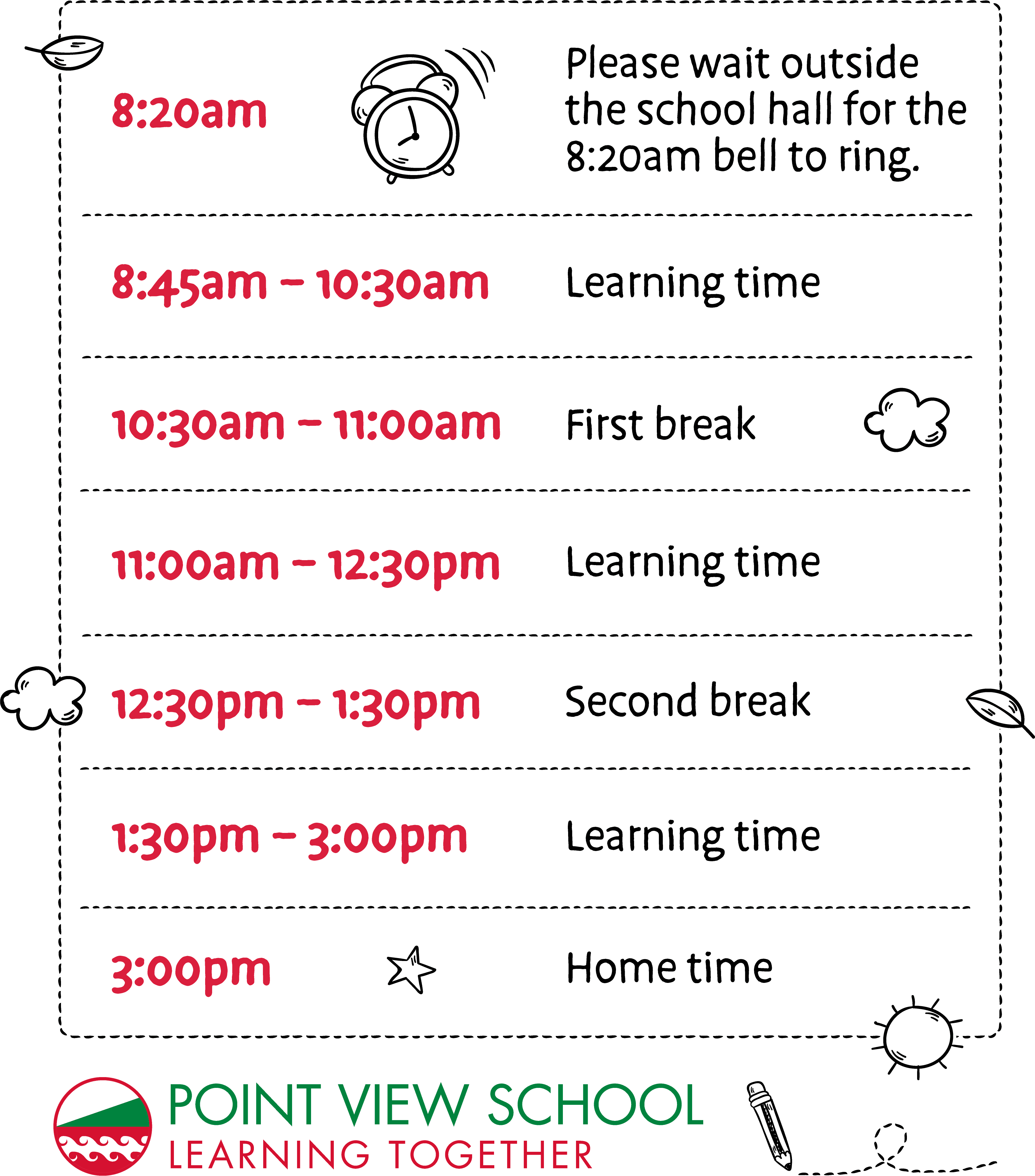 Ideally, students should aim to be at school between 8:10am - 8:20am. Please no children on site before 8:00am.